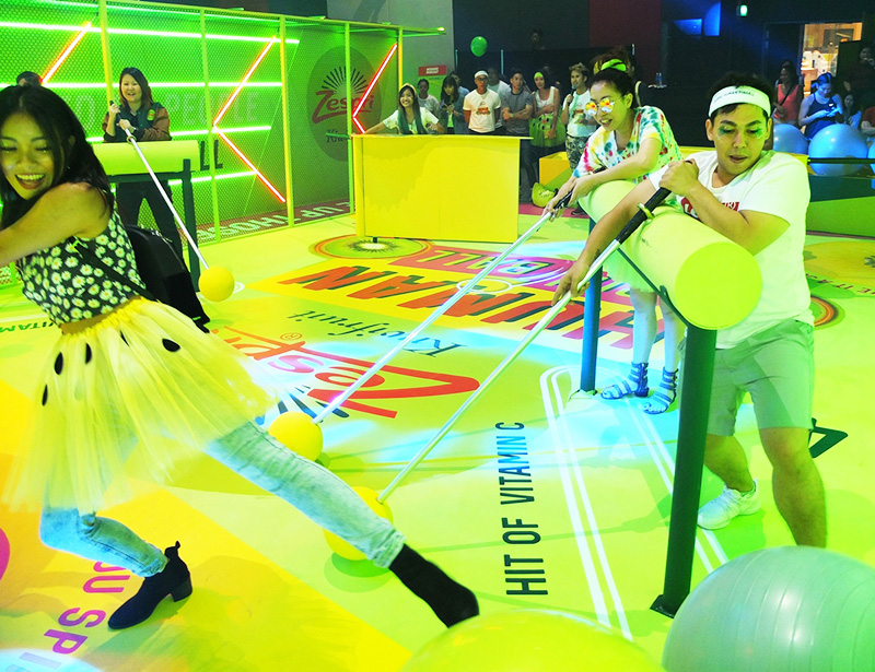 1,800 manhours to build the arena; 2,100 Zespri kiwifruit served.Close to 600 people took part in Zespri’s human pinball arena on 26 Sep 2018. The pinball set at *Scape, measuring 15.9m by 7.5m, took over 1,800 manhours to conceptualize, design and build. Ten people in a team controlled the flippers and bumpers separately to keep the balls from getting out. Each team had 5 minutes to play with energizing music heightening the excitement.